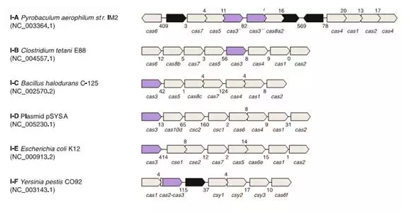I 型CRISPR的標(biāo)簽基因是Cas3(紫色)。在不同的物種中,又將I 型細(xì)分為6個亞型(I-A-E),圖3。