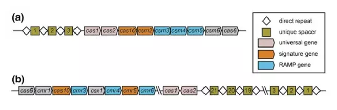 圖8. III 型CRISPR的兩種亞型,(a)為III-A,(b)為III-B。黃色為標(biāo)簽基因。