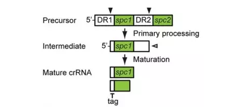 圖9. PrecrRNA經(jīng)過初始加工后,分別形成獨(dú)立中間狀態(tài)的crRNA,之后經(jīng)過3‘端核酸酶的剪切,形成成熟的crRNA。