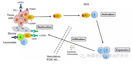 圖1:免疫治療和腫瘤微環(huán)境(TME)。免疫治療成功控制腫瘤需要免疫系統(tǒng)的激活,效應(yīng)細胞擴增,活化的效應(yīng)細胞對腫瘤組織的浸潤并破壞腫瘤細胞。免疫治療的目的旨在增強上述過程,而腫瘤屏障可以大大抑制它們。效應(yīng)T細胞可以被TME中檢查點的分子,如PD-L1抑制。PD-L1的抑制作用可以通抗-PD1 / PDL1來克服。激發(fā)檢查點抗體用于激活免疫細胞。但是,一些抗體,如抗CD40也可以在基質(zhì)細胞發(fā)揮優(yōu)化腫瘤控制的作用。將ECM形成腫瘤屏障阻止T細胞到達TME破壞腫瘤。另一方面,淋巴細胞向TME中的浸潤可以通過細胞因子/趨化因子的誘導(dǎo)/遞送得到增強。