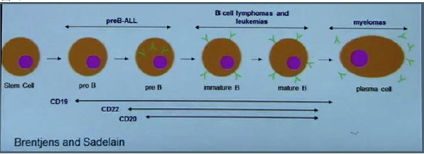 從圖8中看出,CD19在pre-B 和 成熟B細(xì)胞,包括正常和惡性增殖的B細(xì)胞表達(dá), 但是淋巴干細(xì)胞和成熟漿細(xì)胞沒有CD19。帶有抗CD19 scFv 的CAR-T 細(xì)胞可以攻擊pre-B 和成熟B細(xì)胞而不傷害淋巴干細(xì)胞,保留了淋巴干細(xì)胞的再生功能。使用抗CD19的CAR-T細(xì)胞進(jìn)行