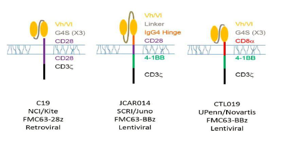 Juno Therapeutics (JUNO)則與上述的三家醫(yī)學(xué)機(jī)構(gòu)合作。在2016 6月ASCO上報道的臨床研究中,51名復(fù)發(fā)或難治性(r / r)急性淋巴細(xì)胞白血?。ˋLL)成年患者用環(huán)磷酰胺或氟達(dá)拉濱/ 環(huán)磷酰胺,然后輸注JCAR015。隨訪研究觀察到90%的完全緩解率(CR)。然而在同年7月6日,JCAR015在Ⅱ期臨床試驗中導(dǎo)致2例患者腦水腫死亡而被叫停。JUNO認(rèn)為是由于CAR-T治療前用藥氟達(dá)拉濱引起。但是去除氟達(dá)拉濱后繼續(xù)臨床試驗,11月23日又出現(xiàn)了三個腦水腫死亡病例,JUNO不得不終止JCAR015臨床試驗,痛失了在CAR-T的領(lǐng)先地位。JUNO將其重心轉(zhuǎn)向其它產(chǎn)品,JCAR17 和 JCAR14等。它們的區(qū)別見圖9。