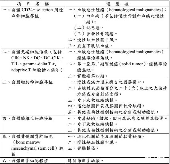 6項細胞治療項目分別為,自體周邊血干細胞移植、自體免疫細胞治療(包括CIK、NK、DC、DC-CIK、TIL、gamma-delta T之adaptive T細胞輸入療法)、自體脂肪干細胞移植、自體纖維母細胞移植、自體間充質(zhì)干細胞移植、自體軟骨細胞移植術(shù)。