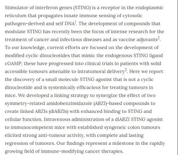 11 月7日,Nature 雜志刊發(fā)了一項最新成果, Joshi M. Ramanjulu 教授等44 名科學家,共同發(fā)現了一種小分子 STING (干擾素刺激基因),這很可能捅破了腫瘤免疫治療的最后一層窗戶紙。